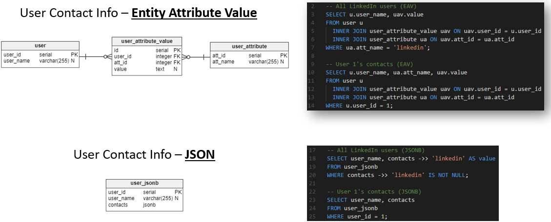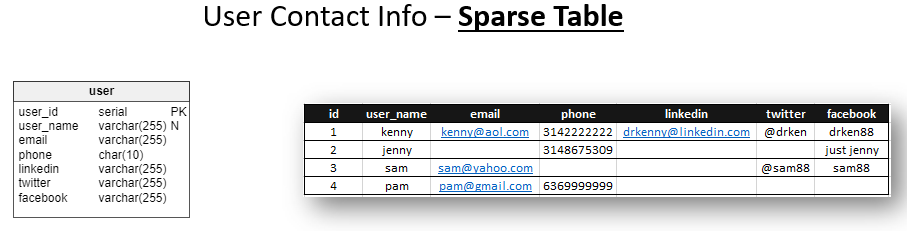 INSERT INTO users (user_name, contacts) VALUES ('sam', '{ "email": "sam@yahoo.com", "twitter": "@sam88", "facebook": "sam88"}');